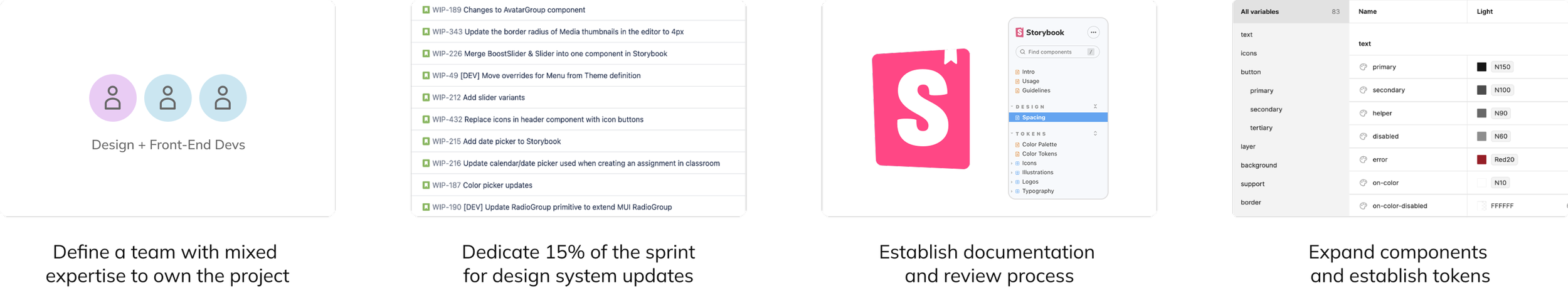 Having proven the system’s impact, I assigned a designer to lead its next phase with two developers. They established processes and tools to ensure consistent growth and maintenance including regular reviews, documentation, and tokens.