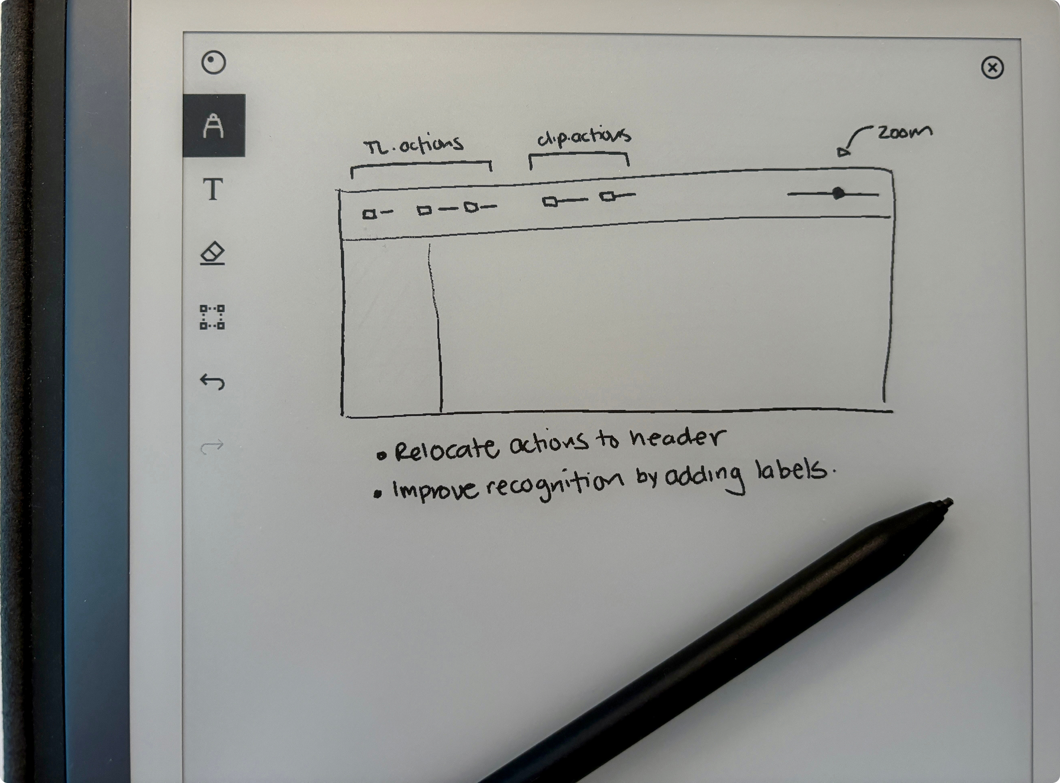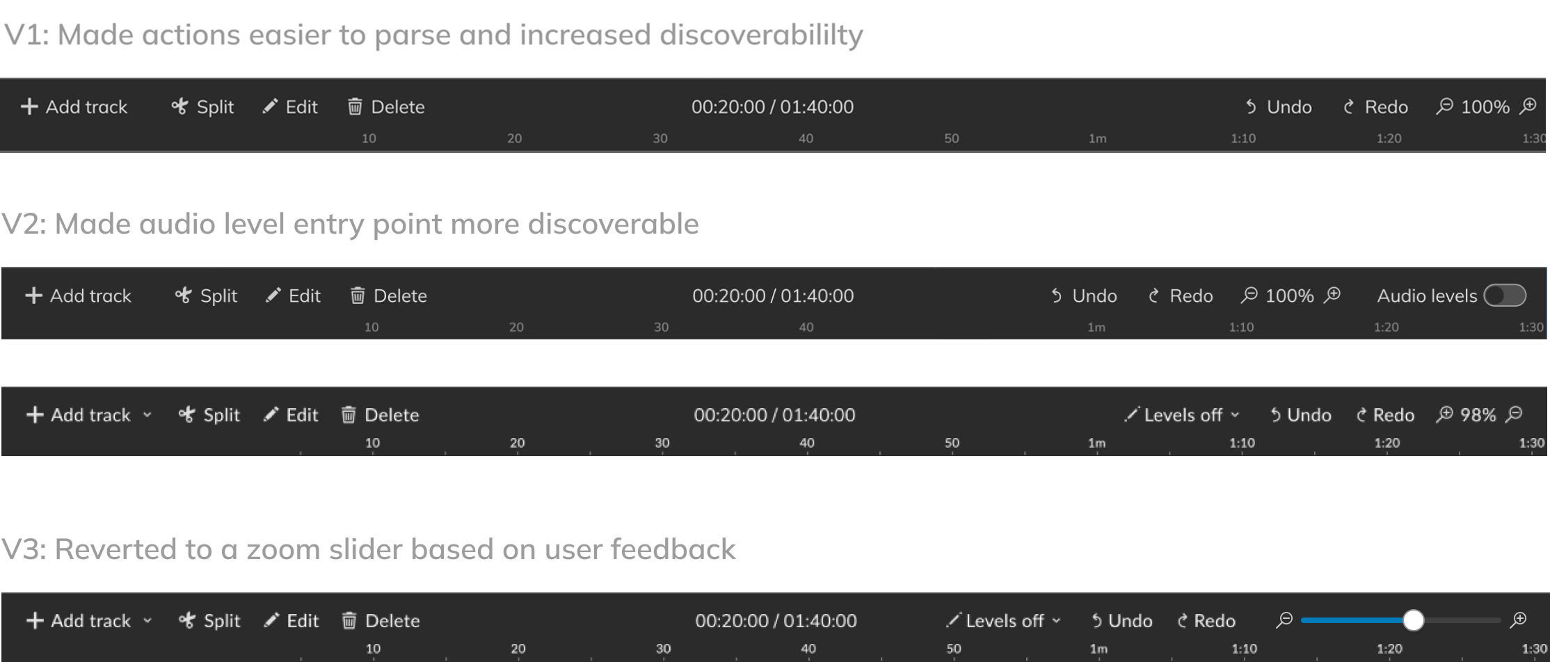 Our research also revealed that users were struggling to find timeline actions like undo/redo and the zoom slider. These actions were spread across the interface and at times buried in the UI and were lacking clear labels and affordances. Can you spot the zoom?