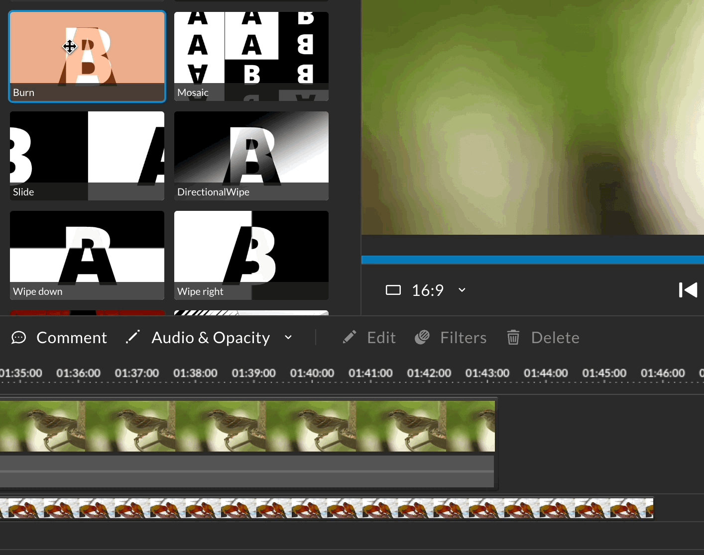 Our research revealed that transitions were a friction point, as users expected them as effects between clips rather than items that needed to be dragged onto a clip. I redesigned them to appear as in-context hints when a clip was selected. This improved discoverability and usability.